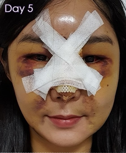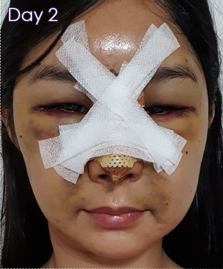 Bruising shows up around day two or three. It usually starts near your eyes and creeps down to your upper cheeks. The colors range from deep purple to almost black-blue.