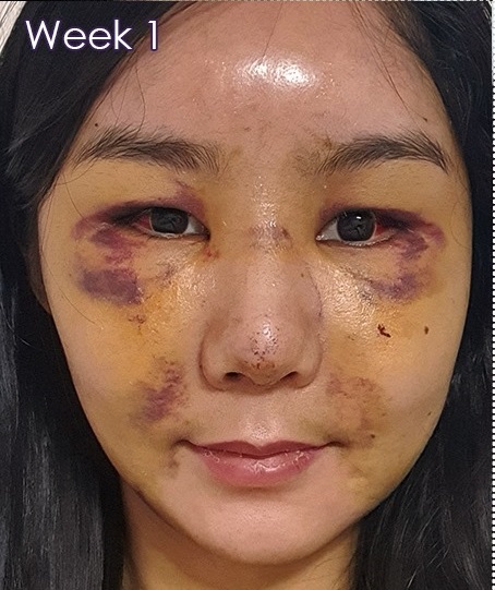 By the end of week one, your bruising has probably gone from deep purple to greenish-yellow. Not pretty, but a good sign—it means your body’s reabsorbing it.